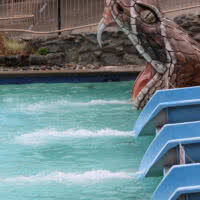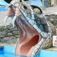 We hope you aren’t afraid of snakes! This is a black hole body slide that will take you slithering in between the Blaster & Twister slides into the pool below. Picking up great speeds along the way, this waterslide is extreme! The ride ends with the slider splashing out from under the fierce and gigantic fangs of our mammoth-sized rattle snake.