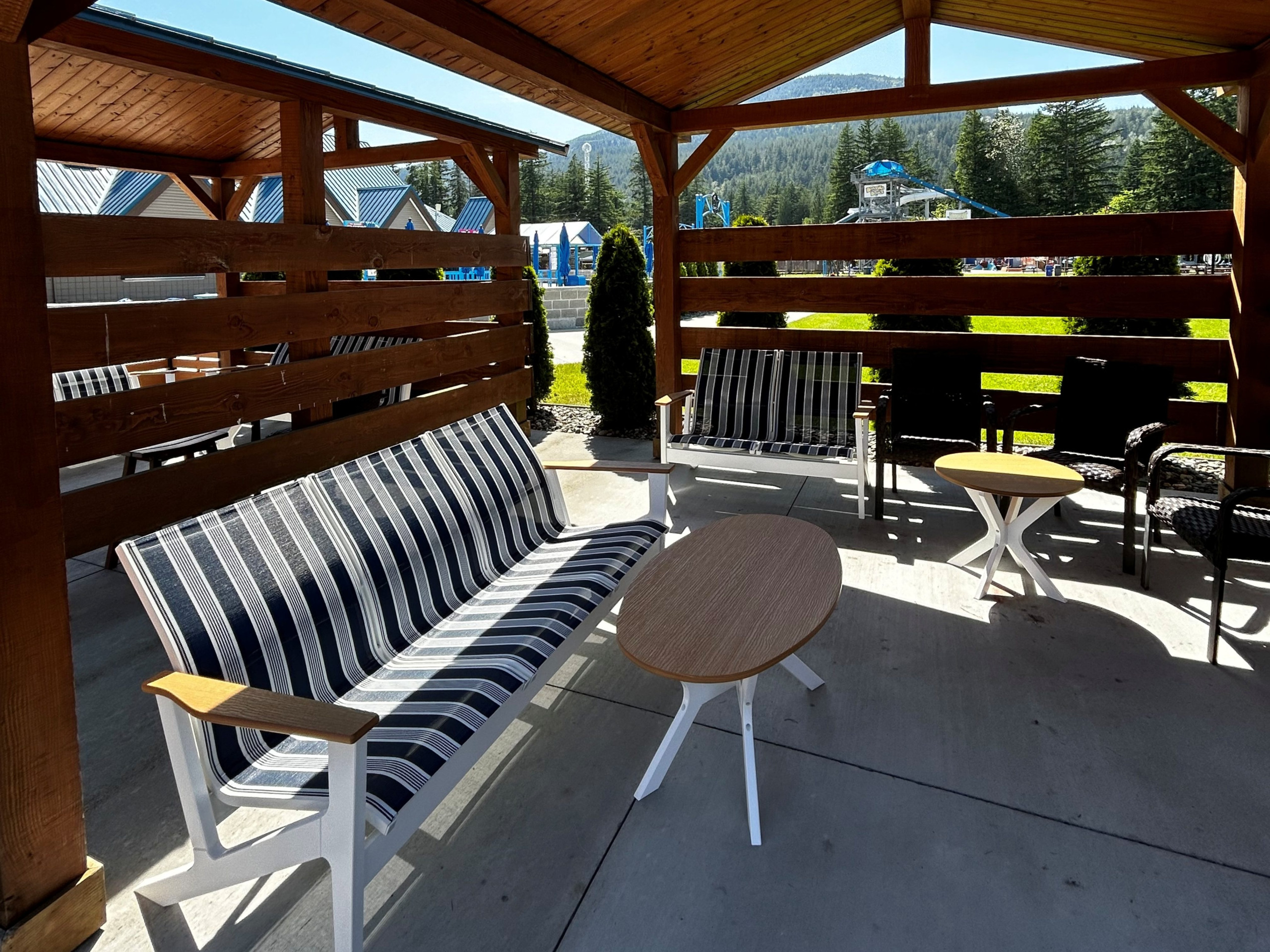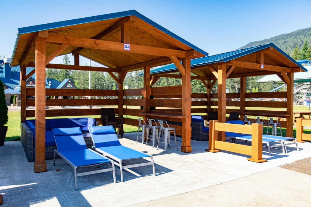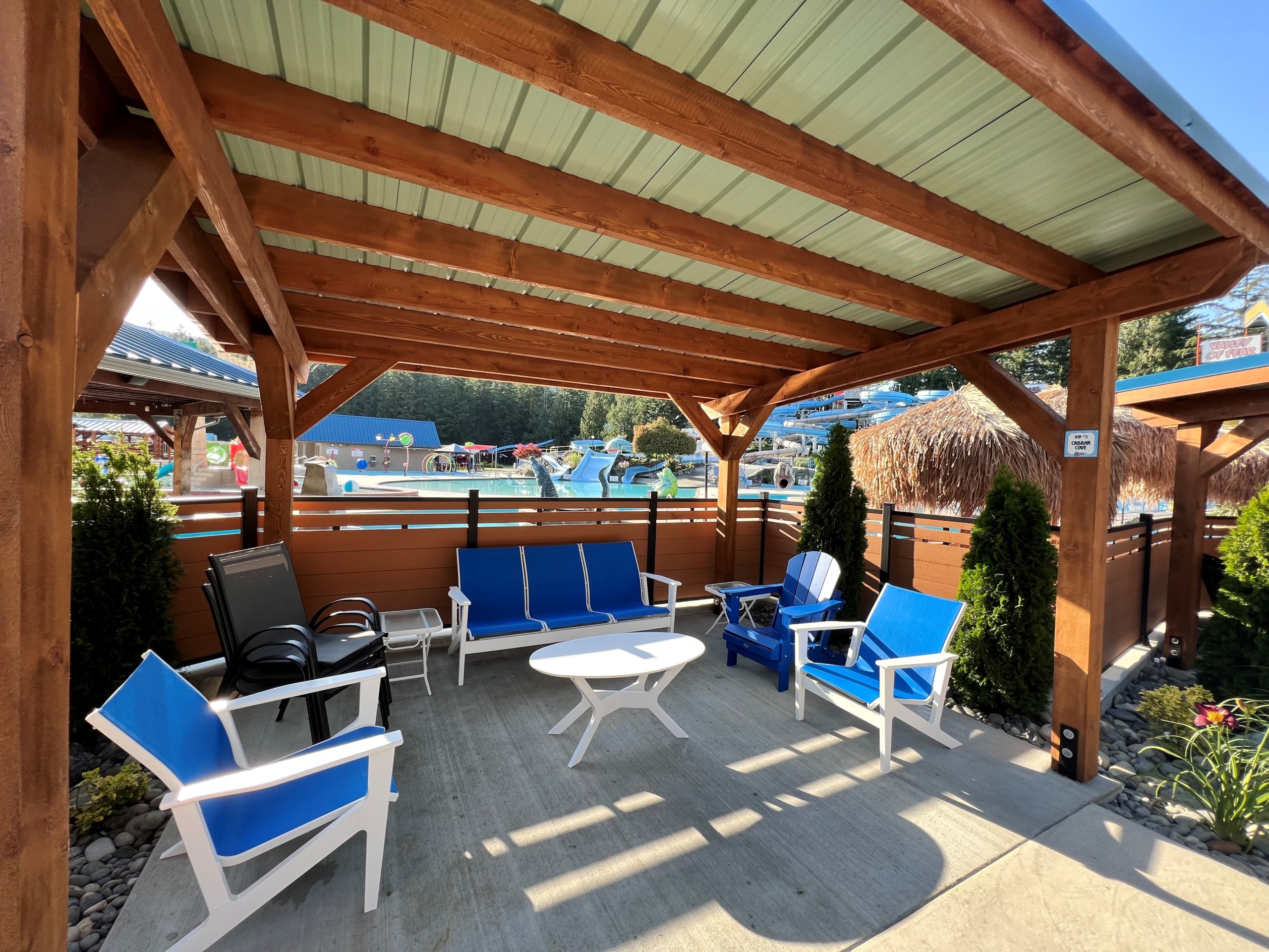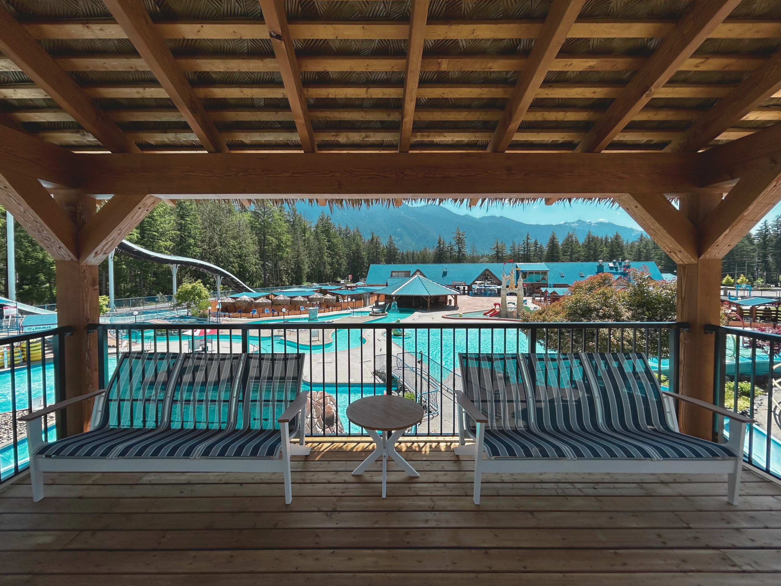 Recline in seating for two in one of our comfortable and shaded spaces alongside the Adventure River!