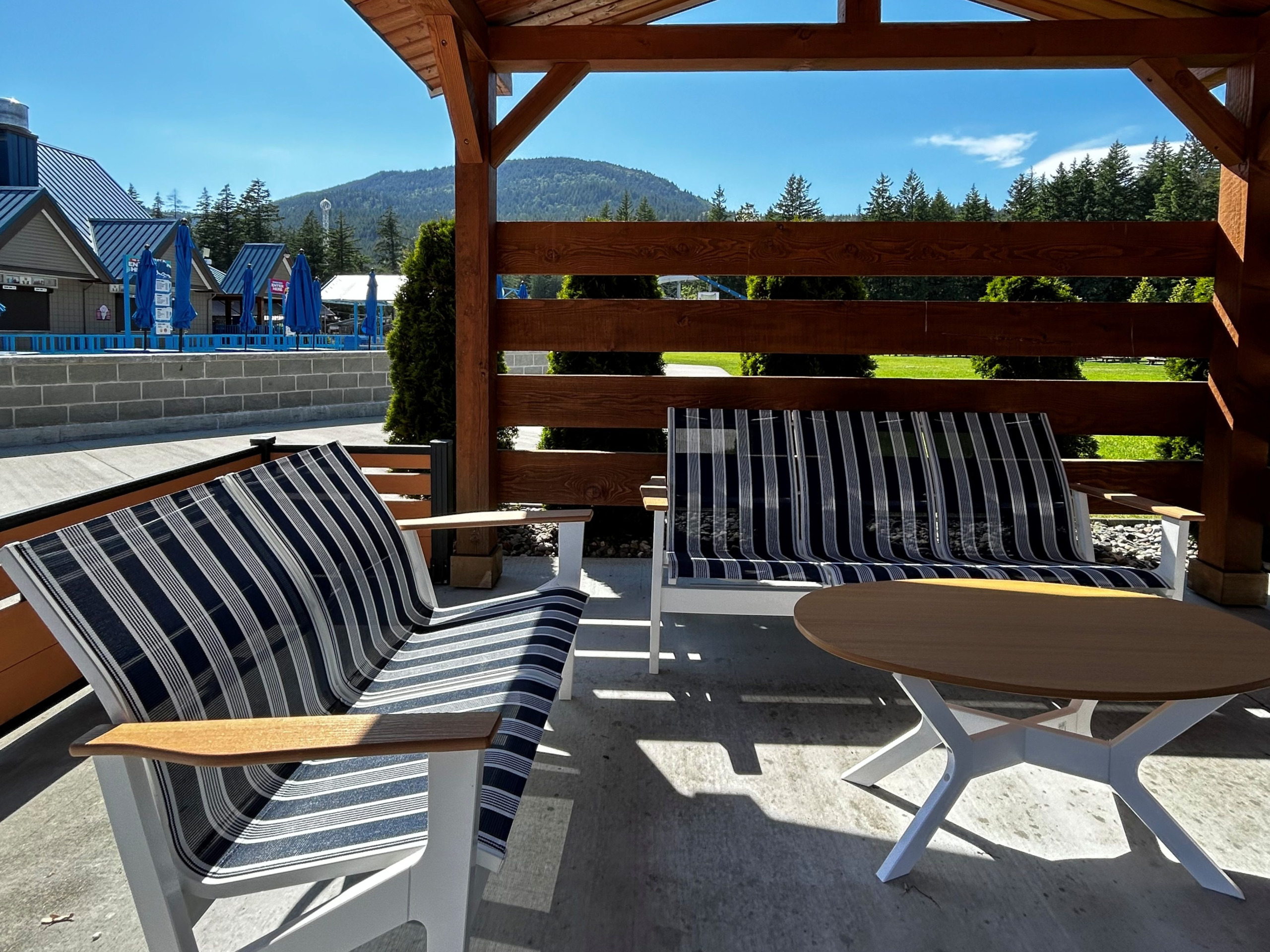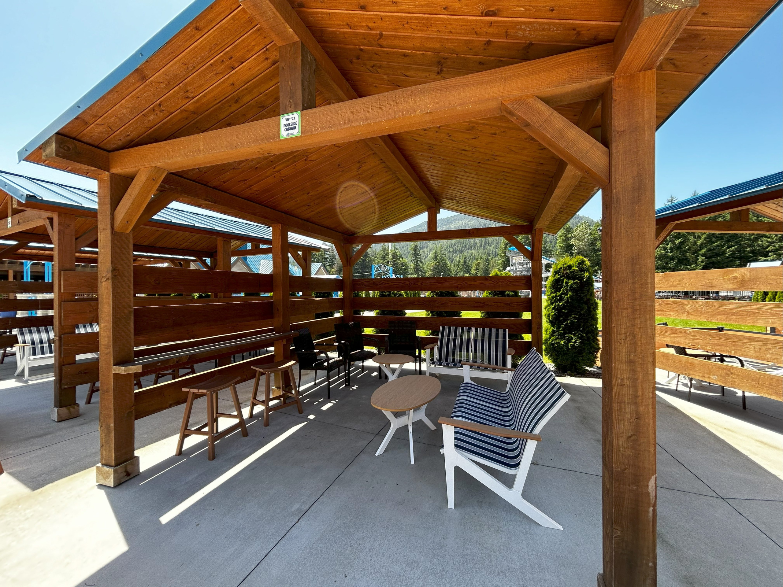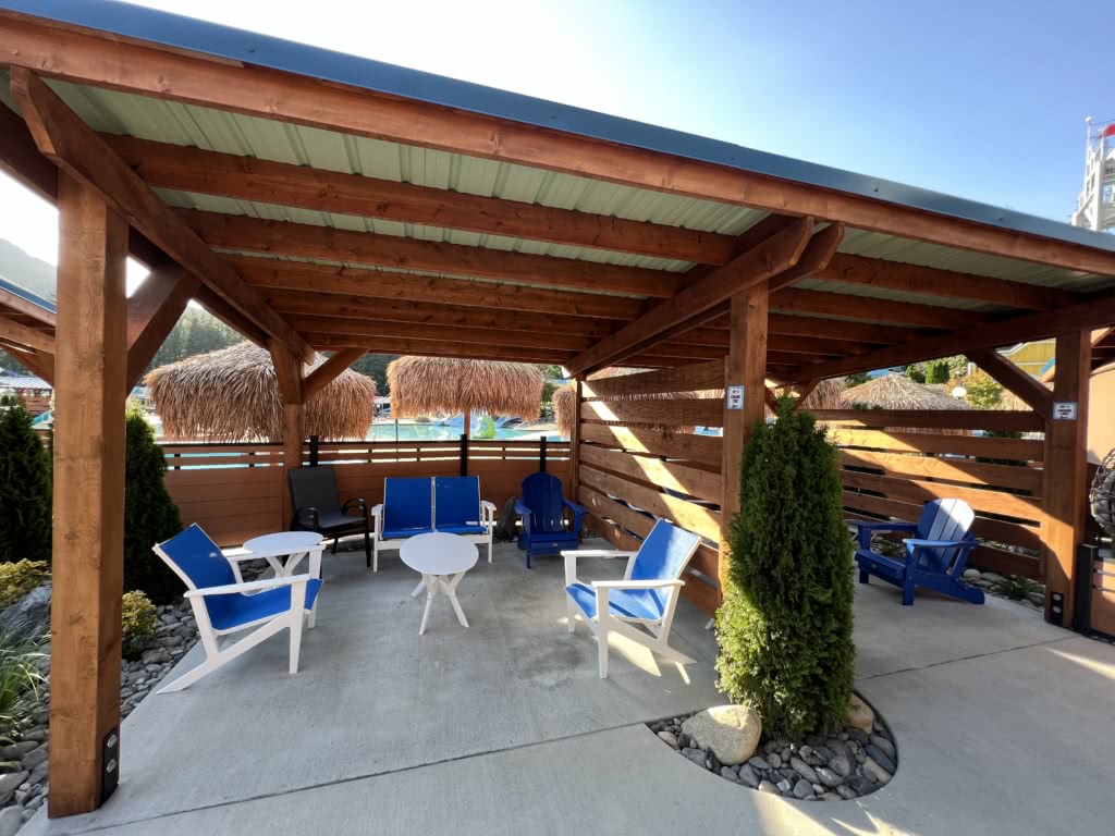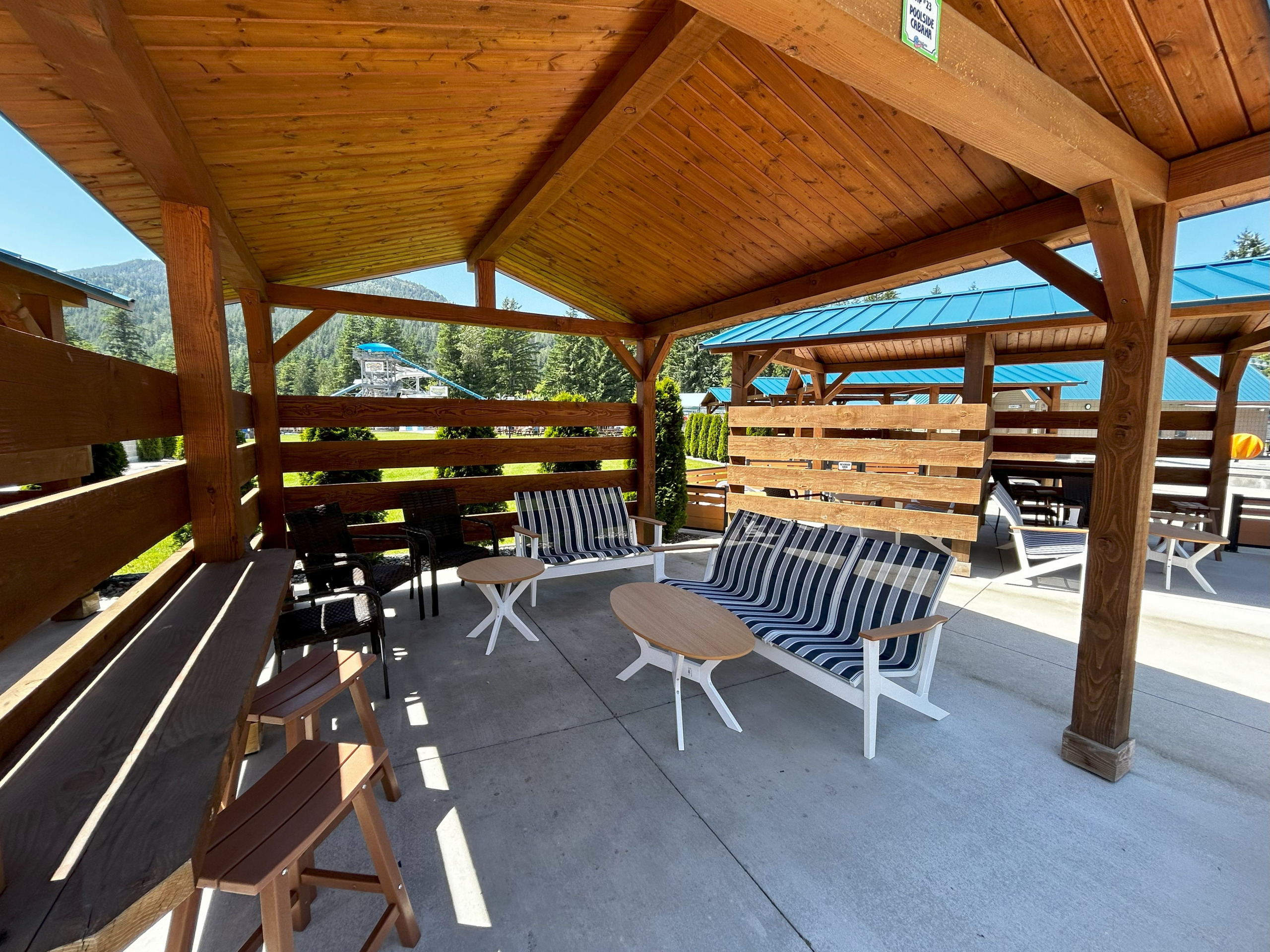 Recline in seating for two in one of our comfortable and shaded spaces alongside the Adventure River!