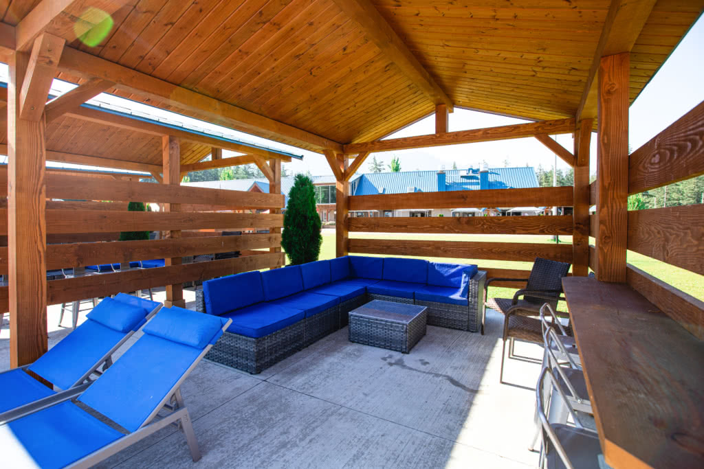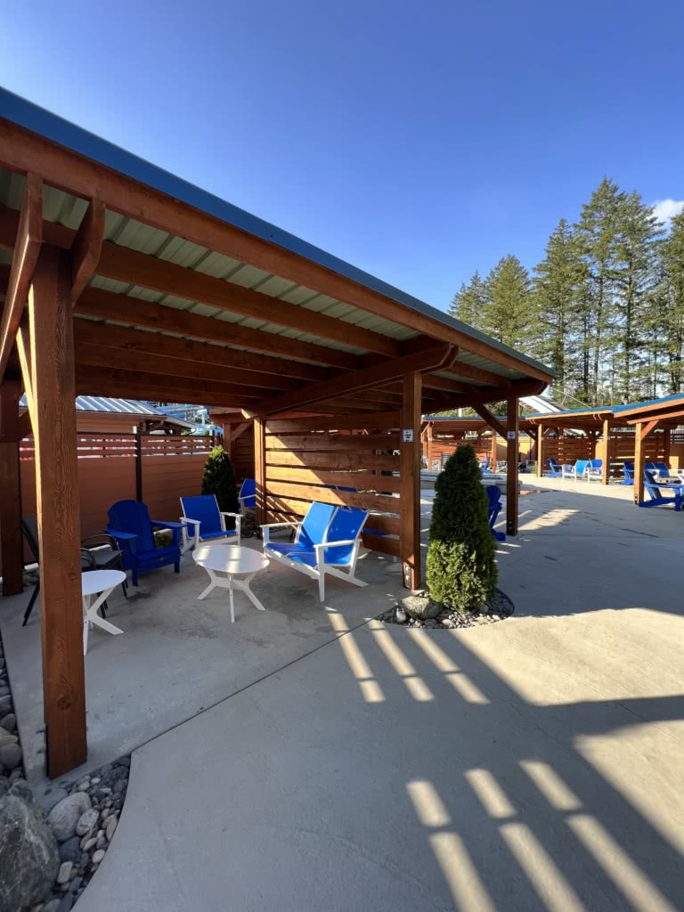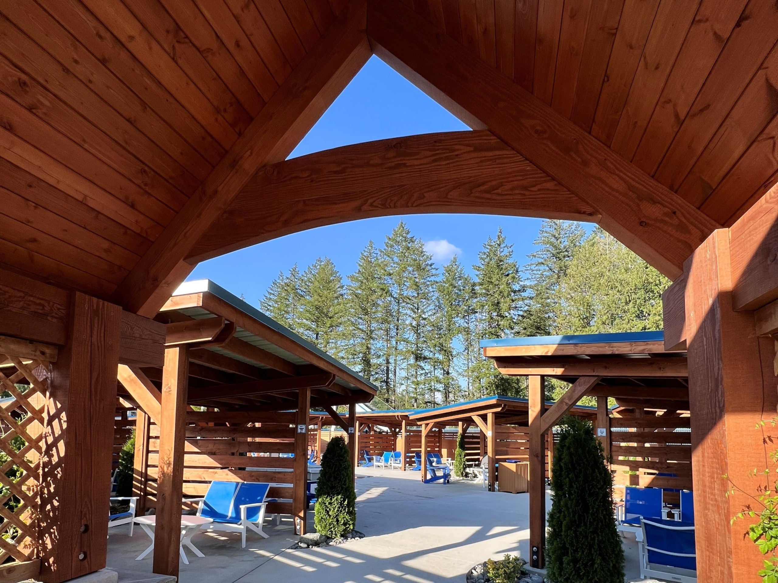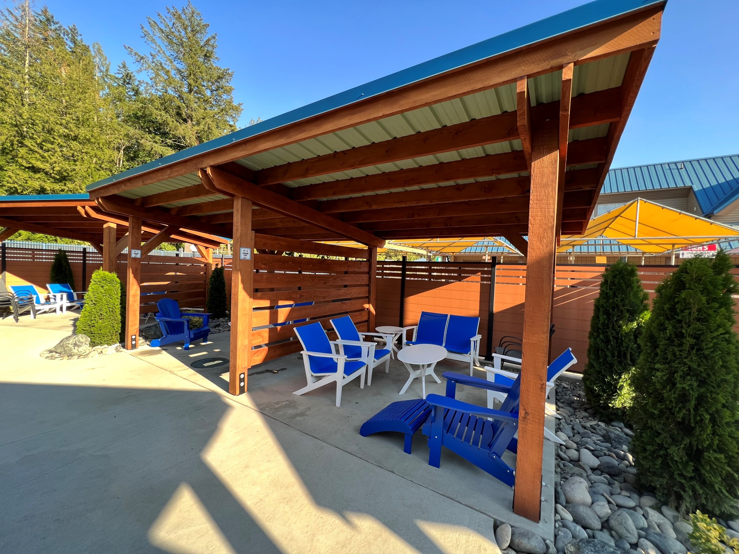 Recline in seating for two in one of our comfortable and shaded spaces alongside the Adventure River!
